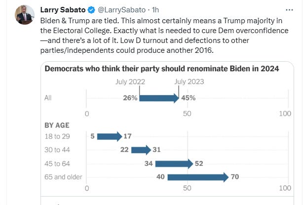 Let’s put this into context: The twice-impeached former president, who faces multiple felony charges and imminent indictments for more; the man who was recently found liable for sexual assault; who dines with neo-Nazis, fawns on genocidal dictators, threatens a regime of “retribution”; and who incited an insurrection to overturn the last election is tied with the incumbent president.