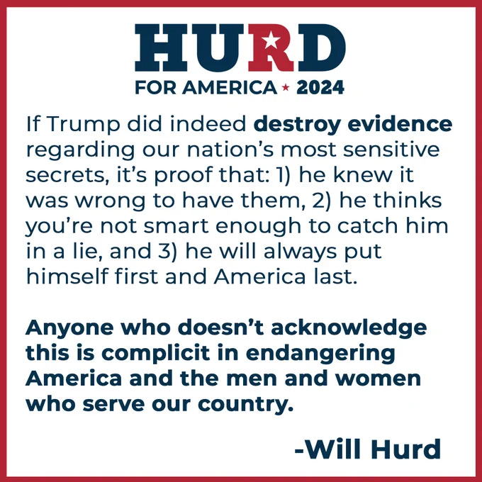 "Donald Trump is not running for president to represent people that voted for him in 2016 and 2020," Hurd said. "Donald Trump is running to stay out of prison.