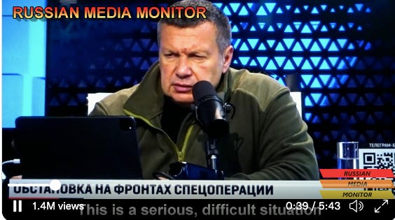 On the same day, Russian TV’s foremost Kremlin shill, Vladimir Solovyov, acknowledged that the situation was “alarming” but tried to stem the flow of bad news on his online show Full Contact with Vladimir Solovyov. He warned against “hysteria,” assured his audience that personal sources in the military had told him “Balakliya is still ours,” and chided those who would treat war like a sports event with scorekeeping rather than “arduous male work.” The surreal effect of this half-hearted spin was heightened by the fact that Solovyov had visible and unexplained cuts on his face: