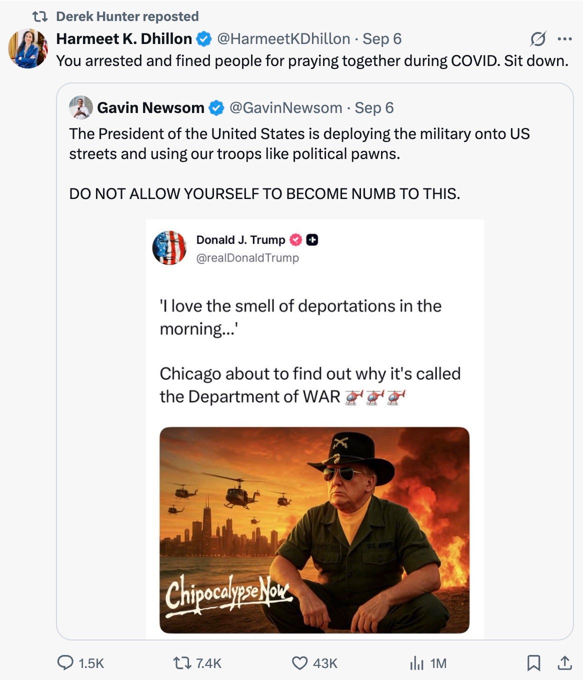 That’s it. The guy has tweeted roughly 9 million times over the last 48 hours and his only response to being catastrophically, hilariously wrong is to retweet someone else saying that Gavin Newsom isn’t allowed to complain about Trump doing what Harris warned about because something-something COVID.