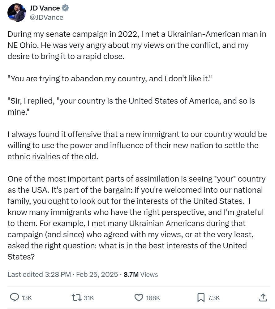 ON TUESDAY, JD VANCE rebuked Americans of Ukrainian ancestry who oppose his betrayal of Ukraine. The rebuke is instructive. It shows us how Vance, Donald Trump, and many of their followers think about immigration and foreign policy. They’re hostile not just to illegal immigration but also to legal immigration from certain countries. And they’re willing to target ethnic minorities in the United States by raising insinuations of dual loyalty.