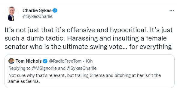 Harassing, berating, and insulting the senator whose vote they desperately need. Tom Nichols and I had lots of thoughts about this last night.