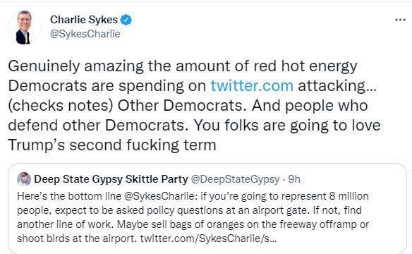 This is still a baffling take. It's not progressives that are the issue here. Progressives are on the same side as the president, and there are more of them. Yesterday you compared them to the Freedom Caucus, but the Freedom Caucus isn't made up of 50+ members. As for Sinema, it's unclear what she actually supports, because all the things that are in the bill that are currently before her are things she ran on! All of them! She was posting tweets about things in the very bill she now says she doesn't support less than six months ago!