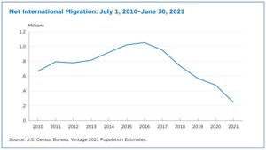 But the one factor we discuss too little is immigration—or rather, when we discuss it we emphasize the wrong aspect. Republicans are obsessed with the southern border and the dreaded waves of people (or sometimes “caravans”) attempting entry. But we’ve long had people thronging the Mexican border. What we haven’t seen in many decades is a serious decline in the number of legal immigrants—a decline that is a big factor in all the things Americans dislike about how things are going right now. If an immigration advocate had wanted to concoct a scenario to demonstrate to Americans just how diminished their lives would be with fewer immigrants, they couldn’t have devised a better scheme than the combination of the Trump administration and the pandemic.
