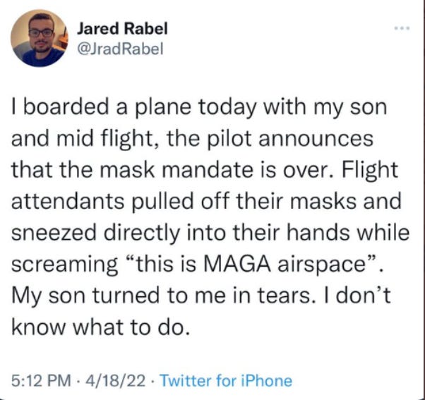 I saw two things yesterday that did not compute. The first was a guy posting a story about how he was on a flight when the pilot came over the intercom to announce the end of the mask mandate and declare that the plane was now in “MAGA airspace.”