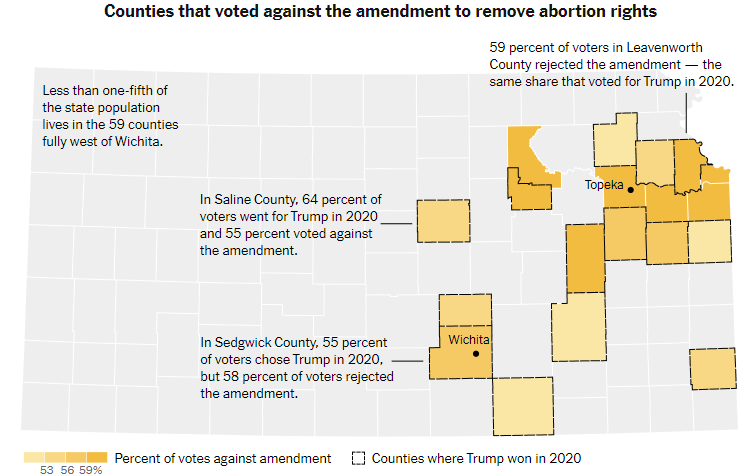 Abortion rights supporters naturally won big in blue counties. No surprise. But they also ran up a huge margin of 68 percent to 32 percent in Johnson County, “a suburban area that was once reliably Republican but that has trended rapidly toward Democrats since Mr. Trump’s entrance into national politics.”
