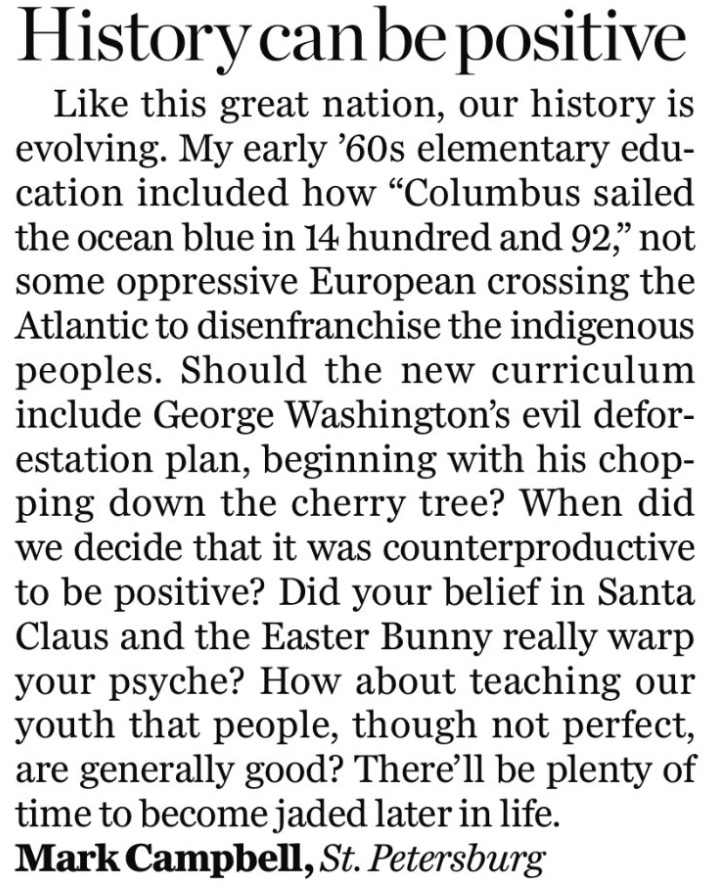 This, of course, isn’t so much history as self-affirming happy talk. (The reference to Santa Claus and the Easter Bunny are perhaps giveaways.) At the margins, this kind of “positive” history becomes indistinguishable from propaganda.