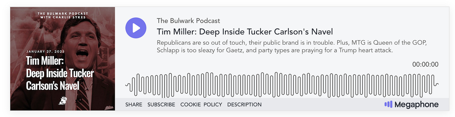Republicans are so out of touch, their public brand is in trouble. Plus, MTG is Queen of the GOP, Schlapp is too sleazy for Gaetz, and party types are praying for a Trump heart attack. Oh, and Tim Miller tells Charlie Sykes he wants to hang with Kari Lake. Your weekend pod.
