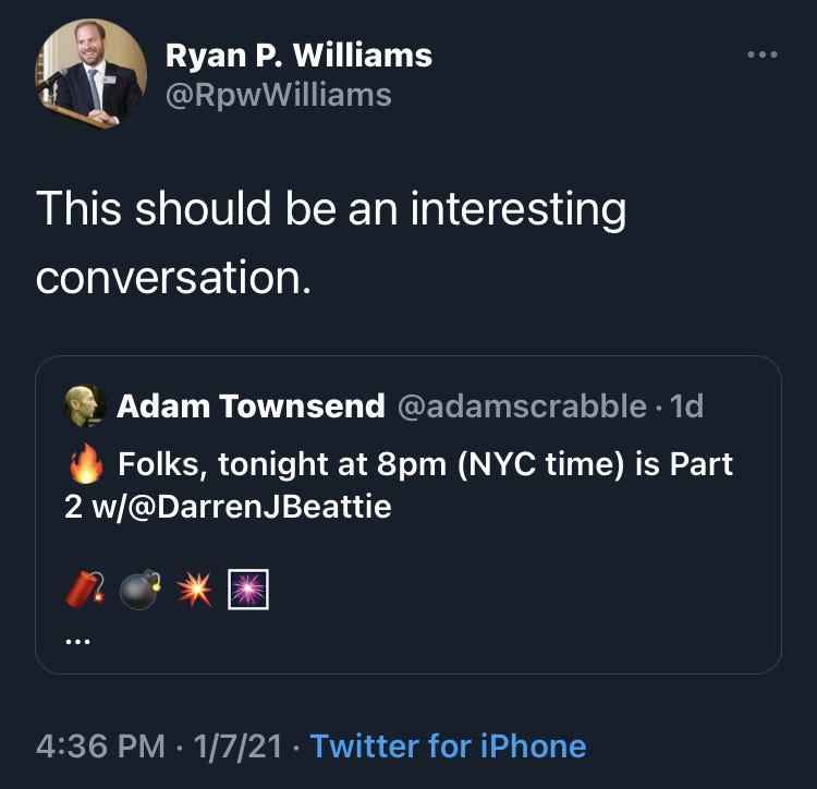 If there were any question before about Darren Beattie’s purported racism, there isn’t anymore, because on January 6, during the insurrection at the Capitol, Beattie was busy sending out vile, racist tweets. As of the publication of this article, they are still up. You can see the worst of them—a series of tweets saying various African Americans must “learn their place” and “take a knee to MAGA”—here, and here, and here, and here, as well as in the image below. Even so, on January 7, Ryan Williams, the current president of the Claremont Institute, continued to promote Beattie on Twitter. Other Twitter users brought Beattie’s January 6 tweets to Williams’s attention, but Williams did not explain, retract, or qualify his promotion of Beattie, or apparently distance himself from Beattie in any way; only sometime later did Williams scrub his Twitter account.