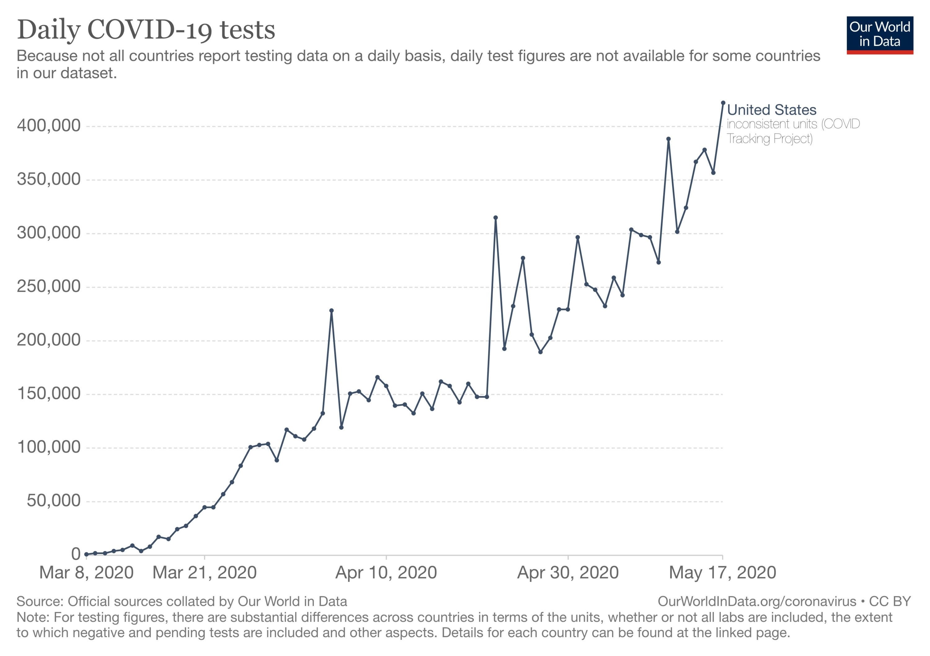 This is still short of where most experts think we need to be—1 million tests per day seems to be the consensus goal. But this trend, too, is moving in the right direction.