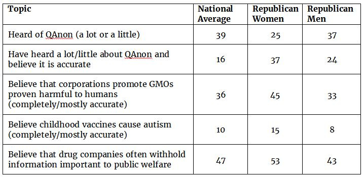 Republican women appear to be far more predisposed to accept conspiracy-related theories and positions than the rest of the public. This doesn’t hold for all conspiracy theories—for instance, Republican women are not more likely than men to believe that President Obama wasn’t born in the United States—but when it comes to QAnon and to information relating to public health, Republican women are more likely to believe unsubstantiated and highly inflammatory information.