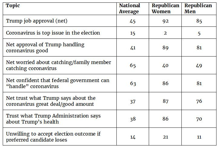When it comes to the issue of COVID-19, the Post/ABC poll shows that Republican women are consistently more supportive of the Trump administration’s efforts and tend to believe in the administration’s pronouncements on the issue. Only 41 percent of Americans approve of Trump’s handling of the virus; that figure is 89 percent among Republican women. Eighty-six percent of GOP women trust what Trump says about the pandemic while just 38 percent of the rest of the country share in that trust. On matters related to public health and COVID-19, the views of Republican women are distinct—and distinctly tilted toward President Trump. Of additional interest is how reluctant these women are to contemplate the president’s defeat: Over 20 percent of Republican women say they would be unwilling to accept an outcome if their preferred candidate lost compared to 14 percent of the general public and 11 percent of Republican men.