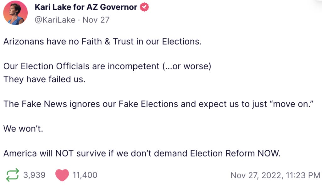 Here’s what he doesn’t say: “Kari Lake lost and it’s time for her to concede.”