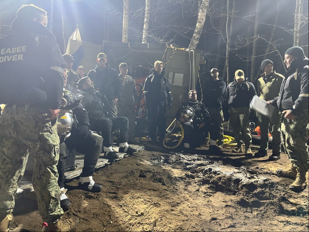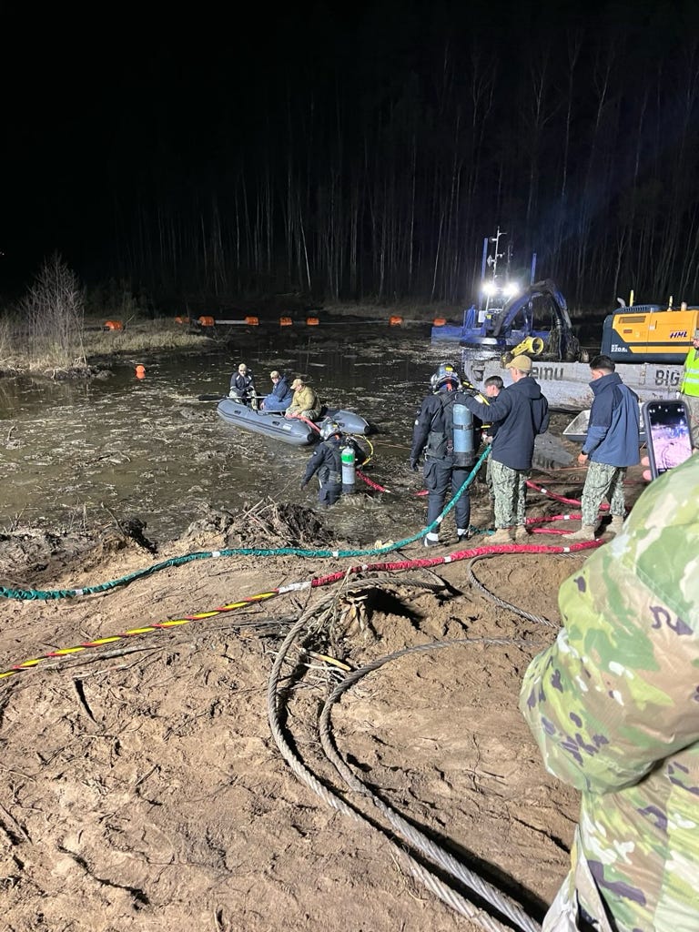 U.S. Navy divers and their Lithuanian special operations colleagues eventually located the vehicle an estimated twenty feet below the surface, buried under layers of mud and still sinking. Using fire hoses underwater to clear sediment from around the submerged vehicle, they finally found and secured the lifting points, the first step in extracting the vehicle.