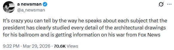 Oh yes, the War Crime gambit. Trump is a weapons grade moron, but he's got a feral sense about when things aren't going well for him. He realizes he's fucked up good, which is why he's got tens of thousands of troops on their way to that region and he's puffing out his chest on social media in order to save face. Say what you will about Iran's clerics; they've taken Trump's measure, and they've concluded they're dealing with what Tom Nichols has called a little boy from Queens. Trump is dangerous, but he's weak.