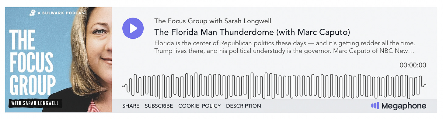 Florida is the center of Republican politics these days — and it’s getting redder all the time. Trump lives there, and his political understudy is the governor. Marc Caputo of NBC News — the best Florida Man in the political press corps — joins Sarah to listen to a group of Florida reverse flipper voters (not Trump 2016/ yes Trump 2020). They also discuss Trump, DeSantis, 2024, and how the FBI search of Mar-a-Lago could impact it all.