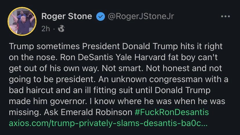 To be sure, the tension between the two Florida egos seems quite real. Jonathan Swan reports that the former president is privately fuming over DeSantis’s refusal to tug the required forelock.