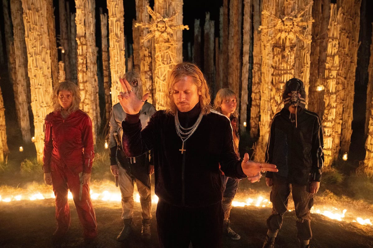 It is, for a long stretch of the film … a buddy comedy. There’s really no other way to explain the relationship between Kelso and Samson. And The Bone Temple only really works because Ralph Fiennes commits so completely to the bit: You absolutely buy him as a hermit whose mind has been warped by loneliness into hoping there’s still a chance for the Alpha whose rage he has soothed by enormous doses of morphine. Indeed, long stretches of the picture involve nothing zombie-oriented at all; rather, Kelso has turned his open-air ossuary into an open-air opium den, he and his big naked friend rolling in the grass, stoned out of their minds, letting the world wash over them.