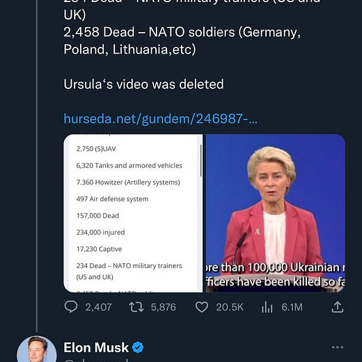 Needless to say, the whole thing is utter bullshit. Thousands of NATO soldiers have not been killed in Ukraine. But Musk eagerly took the bait, anyway.