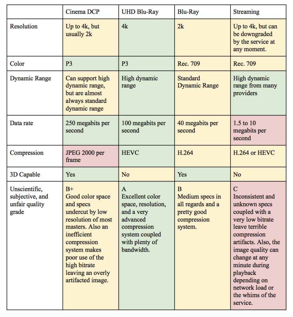 The hardware for watching a movie is one part of the puzzle, but the way we actually receive the movie data is another. For the movie theater, the movie is transmitted as something called a “DCP,” or Digital Cinema Package. In our home setups this is either a Blu-ray, a UHD Blu-ray (a/k/a, a 4K disc), or a streaming service.
