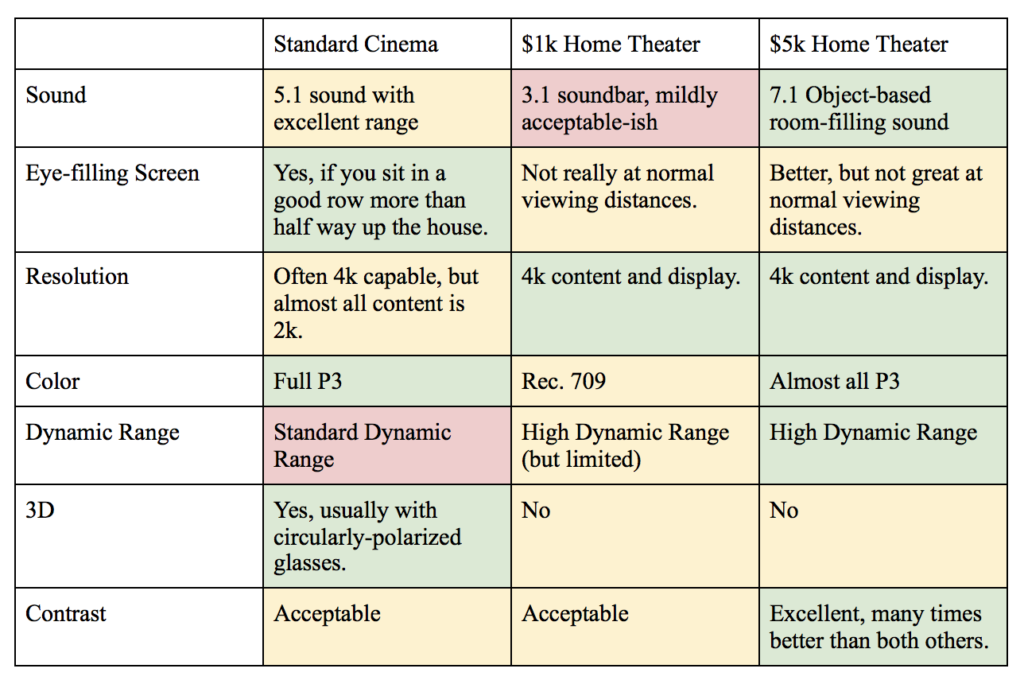 Next let’s look at resolution. Both the home theaters have 4k resolution. The movie theater might be 4k, as almost all new projectors installed in the past few years are, but the standard only calls for 2k resolution. And here’s the secret: almost no cinema content is distributed in 4k, and very little of it is even produced at any level in 4k resolution. The streaming services are driving 4k content creation, so more content has a 4k workflow from camera through edit to distribution, but the final content sent to theaters is almost always 2k even if the master was 4k and the projector is capable of 4k projection. That said, a 4k projector will still produce a much nicer picture on screen than a 2k projector for 2k content because it will reduce the “screen door” effect caused by large blocky pixels on the screen.