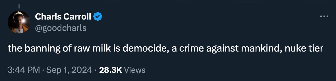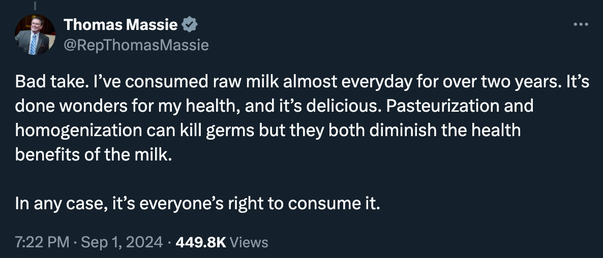 Like the bacteria that lives in unpasteurized dairy products, furious right-wing influencers, media personalities, troll accounts, and even one sitting Republican congressman grew in strength and number, eventually overwhelming Walsh’s post.2 His replies were full of people extolling the magical healing powers of raw milk and condemning Walsh for suggesting it was anything but a powerful elixir.