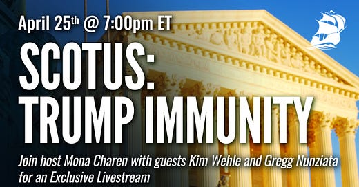 Mona Charen hosts an emergency Bulwark Live, joined by Kim Wehle and Gregg Nunziata, they break down the oral arguments before SCOTUS on the question of presidential immunity in the Jan.