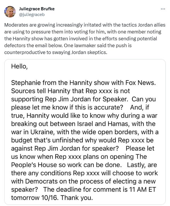 “I’ll vote my conscience, which is a ‘no,’ but I don’t want to be a punching bag for the next three days,” the member said. “Right now, Jordan is woefully short on votes, and his team wants to beat folks into submission."