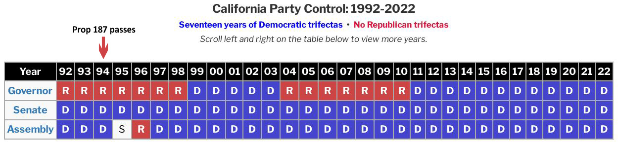 Under these more straitened circumstances, Democrats had dominated in the California legislature since the 1970s, so no surprise that in the post-Prop 187 years, Republicans had a majority in the State Assembly for just 1 year and in the State Senate for 0 years.