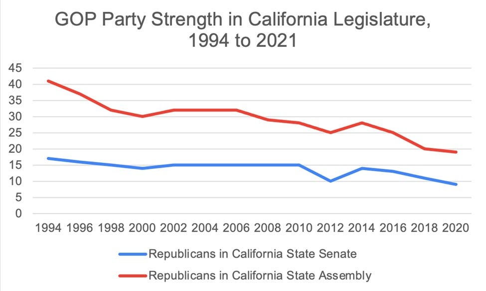 What’s truly striking, however, is the depths to which the California GOP fell in the state legislature. GOP representation in both chambers has dropped by half. Republican seats in the Assembly fell from 41 in 1994 to 19 today; the Senate GOP dropped from 17 to 9.