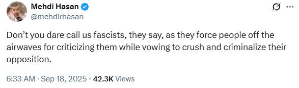 On the curl-up-and-give-up front, the deck is getting stacked pretty high. JVL wrote last night about the latest example. MAGA didn’t love how late-night host Jimmy Kimmel treated the Charlie Kirk story in one line of his show’s opening monologue the other day,1 so Federal Communications Commission Chairman Brendan Carr decided it was time for the government to get involved. “These companies can find ways to take action on Kimmel,” he said, “or there is going to be additional work for the FCC ahead.” Within hours, Kimmel’s corporate owners had bent the knee, announcing the host was suspended indefinitely.