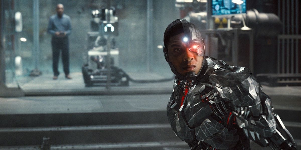 In the original script by Chris Terrio, the version shot by Snyder and shown to Warner Bros. execs in three-and-a-half-hour workprint form, Cyborg (Ray Fisher) is an actual character with an actual arc. We see his disappointment with his absent father, his love for his mother, the tragedy of his near-mortal wounding, the astounding abilities he is given when brought into contact with a mystical piece of science known as a Mother Box, and his forgiving his father. We witness him rise into herodom, become worthy of joining a team that has men both super and bat, women that are wondrous.