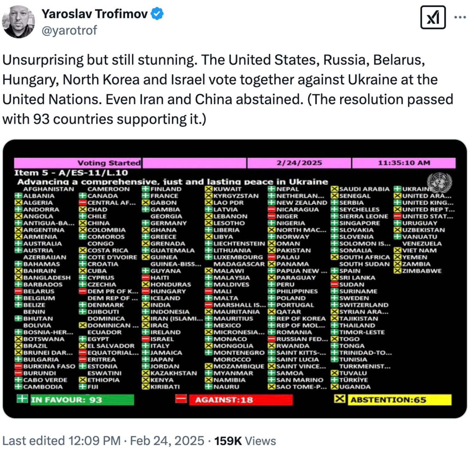 At the U.N. yesterday, the American president transferred America’s strategic alliance to Russia. America now sides with Russia, Belarus, and North Korea against Europe.