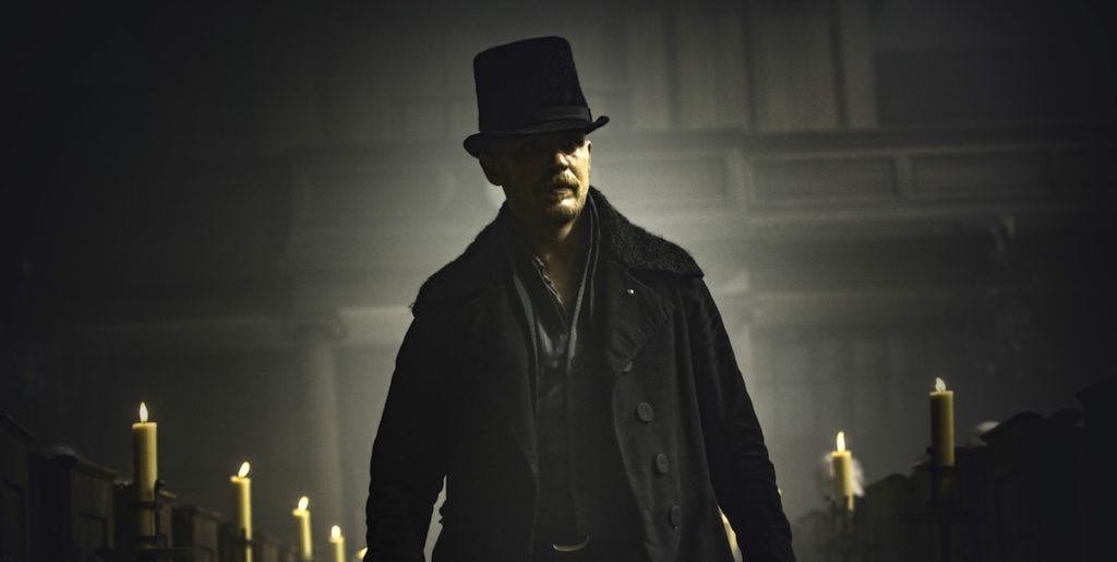 Striding about the mud-strewn streets of the just-past-colonial America, a mid-length trench coat flaring out behind him like a cape more suited for a superhero, even Hardy’s walk conveys murderous intent. Fists balled, one shoulder lurching in front of the other, face scarred and partially obscured by a black top hat conveying both class status and a mockery of the class system whence Hardy’s James Delaney has fled (and, indeed, is at active war with), Hardy looks ripped from the pages of a Gothic horror.